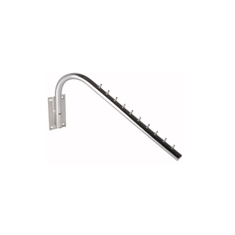 Wieszak pochyły z bolcami o długości 50cm naścienny. Zawieszka zawiera 10 bolców, ktore idealnie odzielają odzież. Wieszak wykonany jest ze stalowej,pokrytej chromem rury fi 25mm. Dzięki bolcom istnieje możliwość zawieszenia odzieży według rozmiarów. Towar prezentowany frontem. Wieszak sprawdza się do prezentacji odzieży. Wieszak ruchomy, obraca się względem ściany