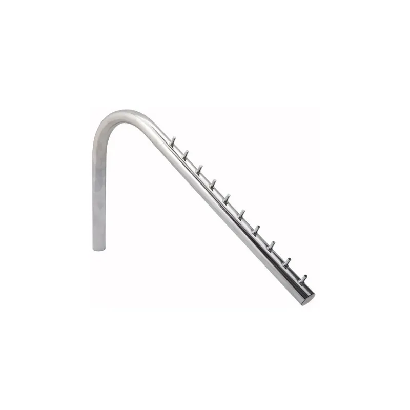 Wieszak zagięty, pochyły z 10 bolcami, chromowany. Wieszak służy do ekspozycji odzieży i innych produktów frontem do klienta.