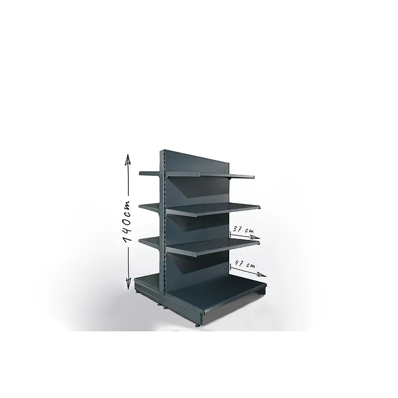 Gondola sklepowa dwustronna o wysokości 140cm. Dolna półka 47cm i 3 półki po 37cm. Do wyboru jest pięć kolorów podstawowych i cztery szerokości segmentów.