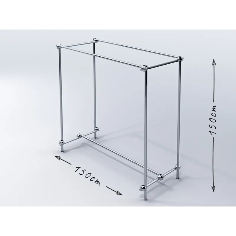 Gondola sklepowa, dwustronna do ekspozycji i magazynowania towaru. Wymiary stojaka to 150x60x150cm. Elementy składowe wykonane z rury fi 25mm chromowanej i złączek chromowanych.