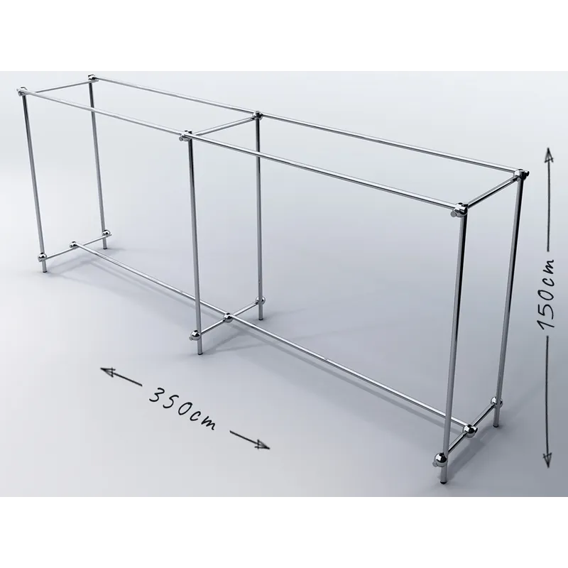 Gondola stojak sklepowy, dwustronna do ekspozycji i magazynowania towaru. Stojak w wymiarze 350x60x150cm. Elementy składowe wykonane z rury fi 25mm chromowanej i złączek chromowanych.