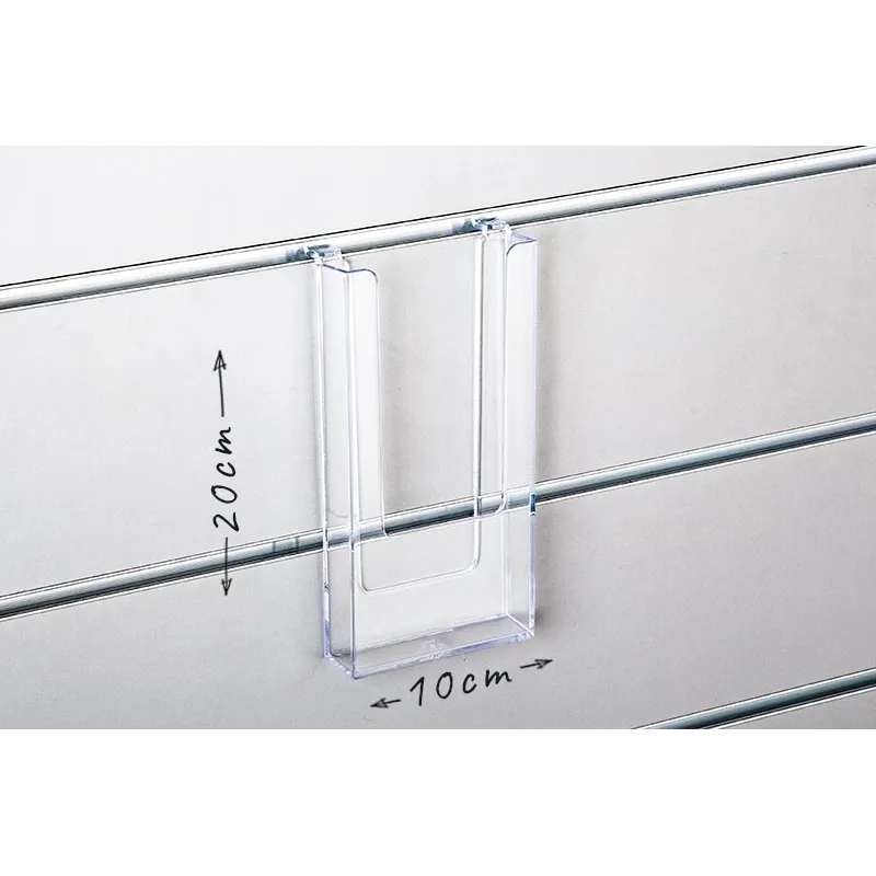 Wieszak do ulotek DL/A6 na sysytem Spacewall, o wymiarach 11,5cm szerokości i 21cm wysokości oraz 2,5cm głębokości wykonany z plexi.