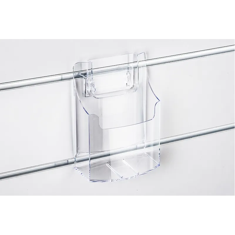 Wieszak do ulotek A5 na sysytem Spacewall, o wymiarach 16cm szerokości i 20cm wysokości oraz 4cm głębokości wykonany z plexi.