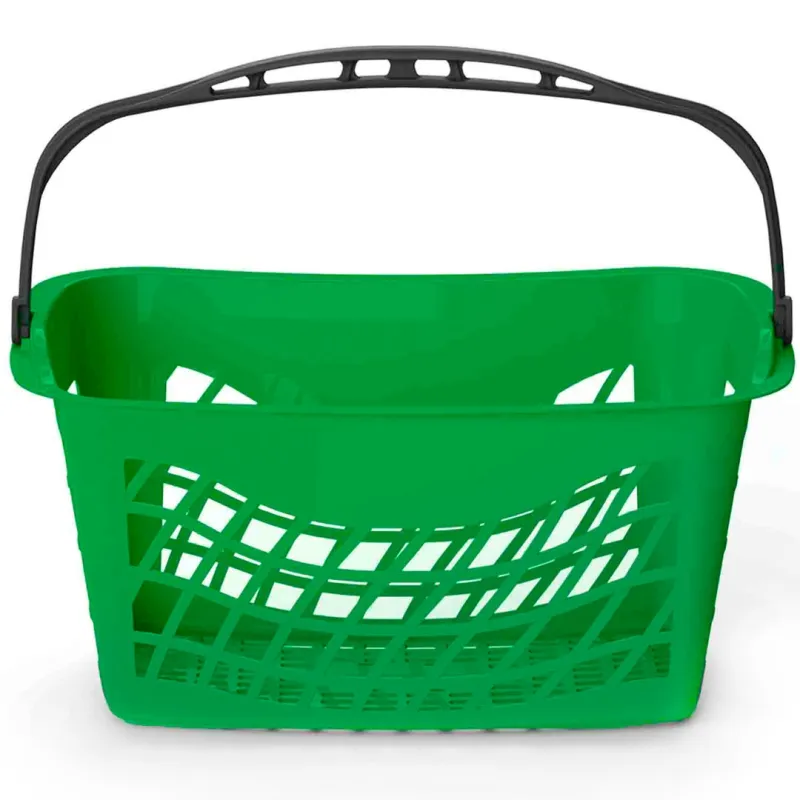 Koszyk sklepowy 26l o szerokości 52cm, głębokości 32cm i wysokości 26cm. Wykonany z tworzywa sztucznego w kolorze zielonym. Na froncie pojemnika znajduje się miejsce z przeznaczeniem na logo. Koszyk posiada jedną składaną czarną rączkę.