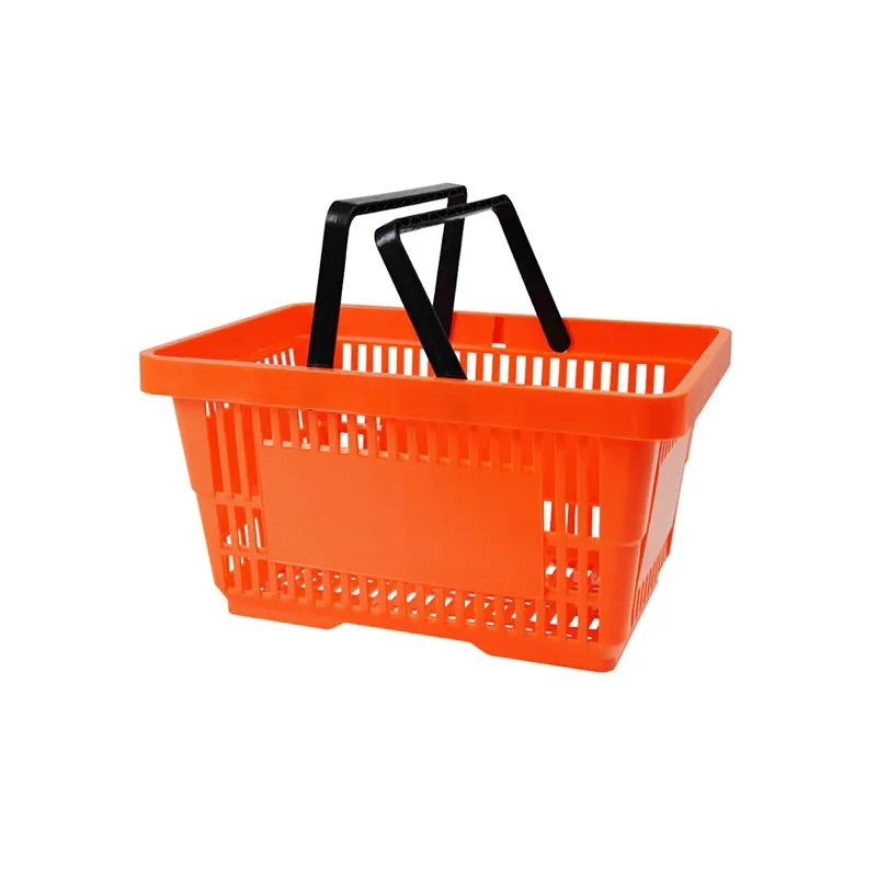 Koszyk sklepowy 22l o szerokości 35cm, głębokości 22cm i wysokości 23cm. Wykonany z tworzywa sztucznego w kolorze pomarańczowym. Na froncie pojemnika znajduje się miejsce z przeznaczeniem na logo. Koszyk posiada dwie, składane, czarne rączki. Najbardziej popularny model.