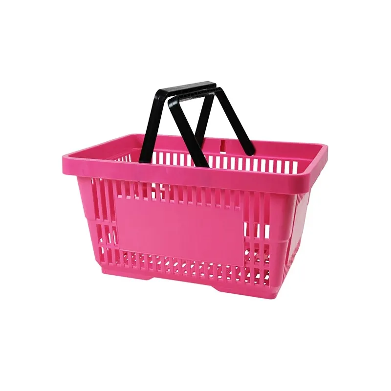 Koszyk sklepowy 22l o szerokości 35cm, głębokości 22cm i wysokości 23cm. Wykonany z tworzywa sztucznego w kolorze różowym. Na froncie pojemnika znajduje się miejsce z przeznaczeniem na logo. Koszyk posiada dwie, składane, czarne rączki. Najbardziej popularny model.