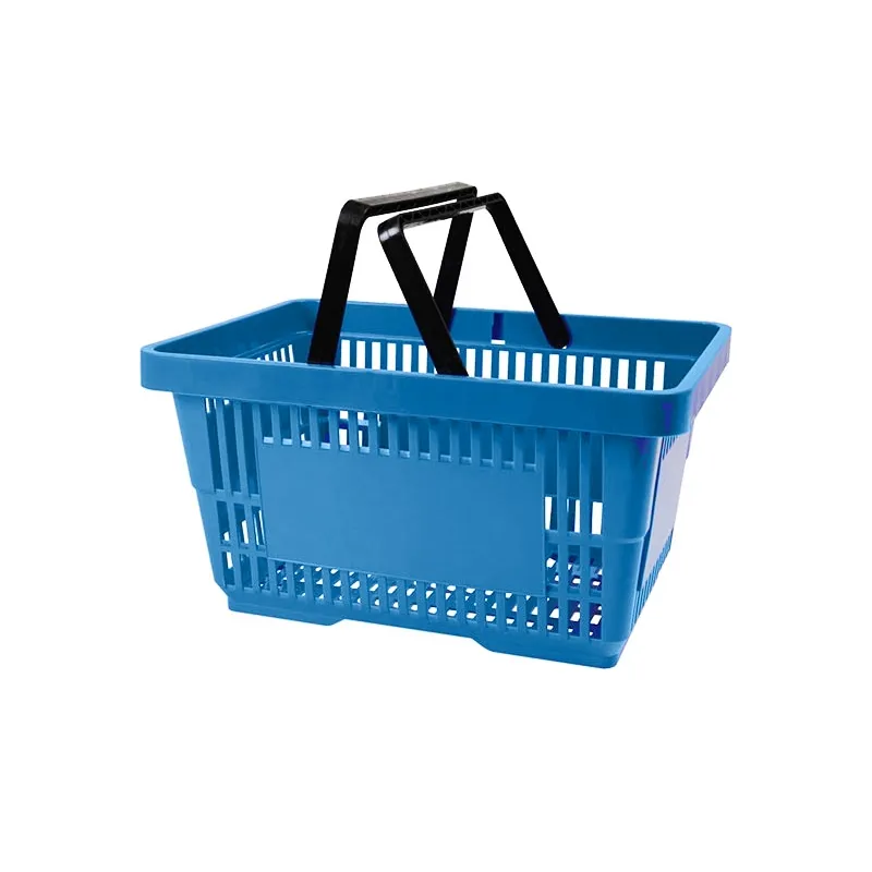 Koszyk sklepowy 22l o szerokości 35cm, głębokości 22cm i wysokości 23cm. Wykonany z tworzywa sztucznego w kolorze jasnoniebieskim. Na froncie pojemnika znajduje się miejsce z przeznaczeniem na logo. Koszyk posiada dwie, składane, czarne rączki. Najbardziej popularny model.