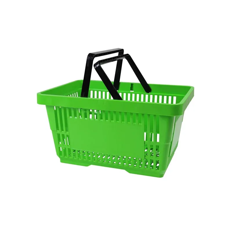 Koszyk sklepowy 22l o szerokości 35cm, głębokości 22cm i wysokości 23cm. Wykonany z tworzywa sztucznego w kolorze jasnozielonym. Na froncie pojemnika znajduje się miejsce z przeznaczeniem na logo. Koszyk posiada dwie, składane, czarne rączki. Najbardziej popularny model.
