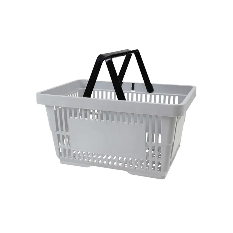 Koszyk sklepowy 22l o szerokości 35cm, głębokości 22cm i wysokości 23cm. Wykonany z tworzywa sztucznego w kolorze jasnoszarym. Na froncie pojemnika znajduje się miejsce z przeznaczeniem na logo. Koszyk posiada dwie, składane, czarne rączki. Najbardziej popularny model.