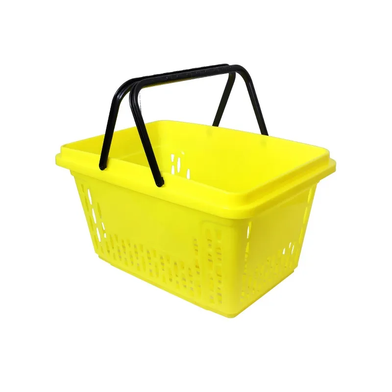 Koszyk sklepowy 28l o szerokości 49cm, głębokości 34cm i wysokości 27cm. Wykonany z tworzywa sztucznego w kolorze żółtym. Na froncie pojemnika znajduje się miejsce z przeznaczeniem na logo. Koszyk posiada dwie, składane, czarne rączki.