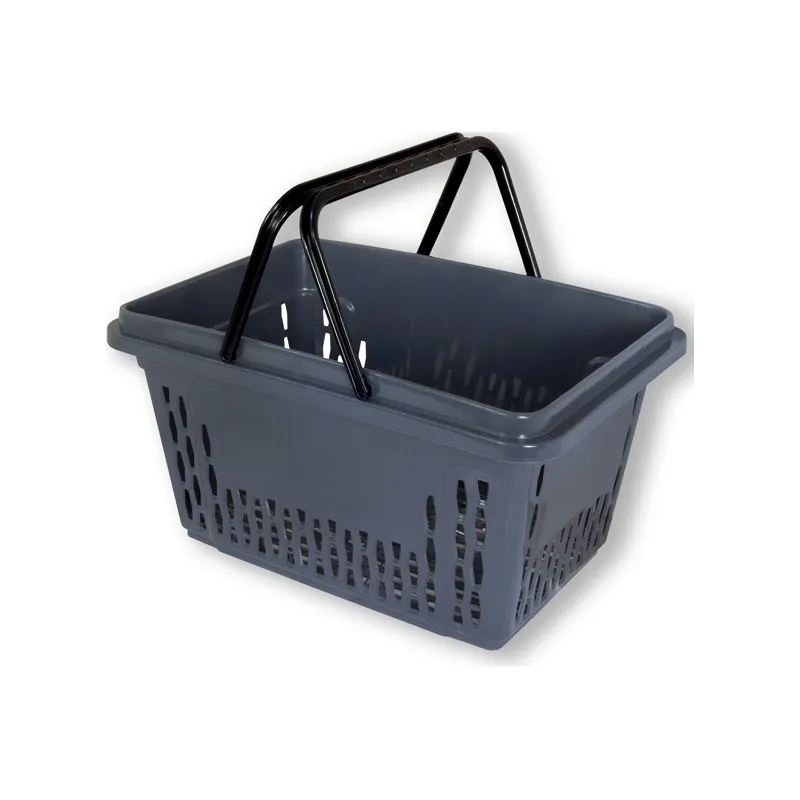 Koszyk sklepowy 28l o szerokości 49cm, głębokości 34cm i wysokości 27cm. Wykonany z tworzywa sztucznego w kolorze szarym. Na froncie pojemnika znajduje się miejsce z przeznaczeniem na logo. Koszyk posiada dwie, składane, czarne rączki.