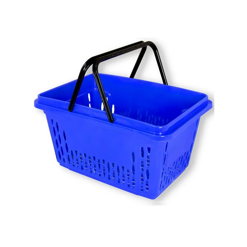 Koszyk sklepowy 28l o szerokości 49cm, głębokości 34cm i wysokości 27cm. Wykonany z tworzywa sztucznego w kolorze niebieskim. Na froncie pojemnika znajduje się miejsce z przeznaczeniem na logo. Koszyk posiada dwie, składane, czarne rączki.