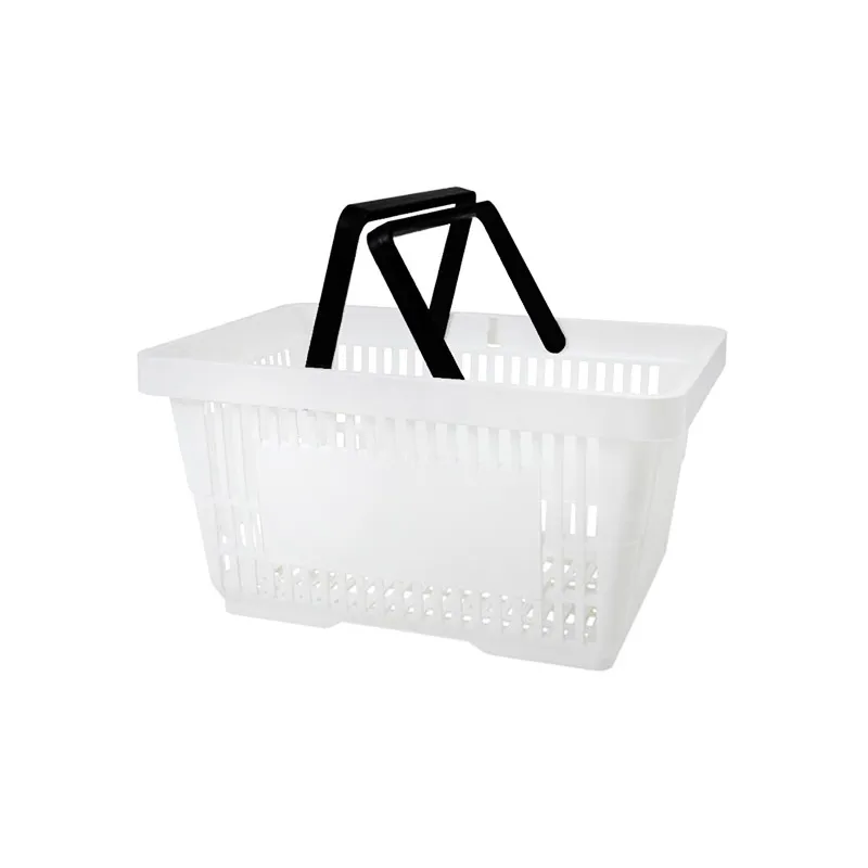 Koszyk sklepowy 22l o szerokości 35cm, głębokości 22cm i wysokości 23cm. Wykonany z tworzywa sztucznego w kolorze białym. Na froncie pojemnika znajduje się miejsce z przeznaczeniem na logo. Koszyk posiada dwie, składane, czarne rączki. Najbardziej popularny model.