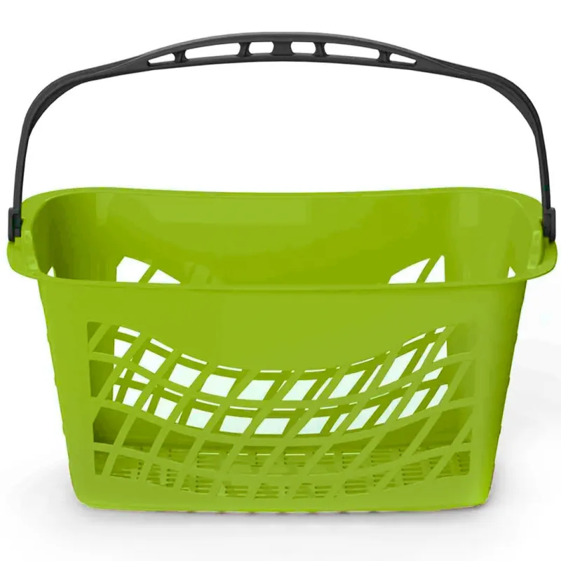 Koszyk sklepowy 26l o szerokości 52cm, głębokości 32cm i wysokości 26cm. Wykonany z tworzywa sztucznego w kolorze groszkowym. Na froncie pojemnika znajduje się miejsce z przeznaczeniem na logo. Koszyk posiada jedną składaną czarną rączkę.