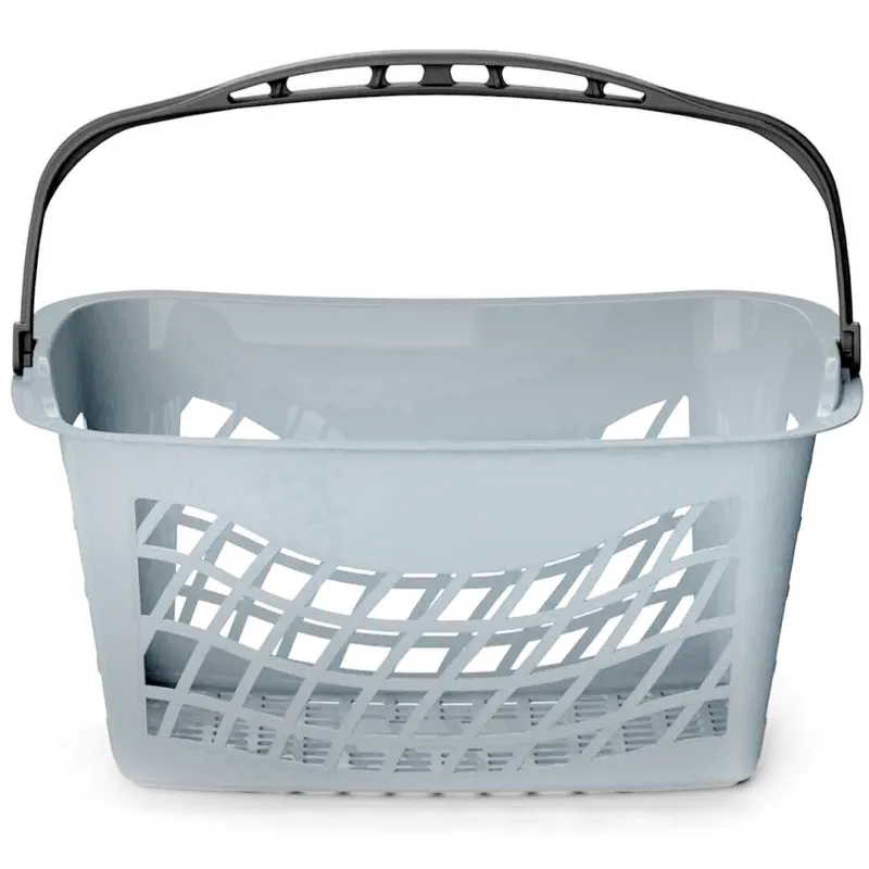 Koszyk sklepowy 26l o szerokości 52cm, głębokości 32cm i wysokości 26cm. Wykonany z tworzywa sztucznego w kolorze szarym . Na froncie pojemnika znajduje się miejsce z przeznaczeniem na logo. Koszyk posiada jedną składaną czarną rączkę.