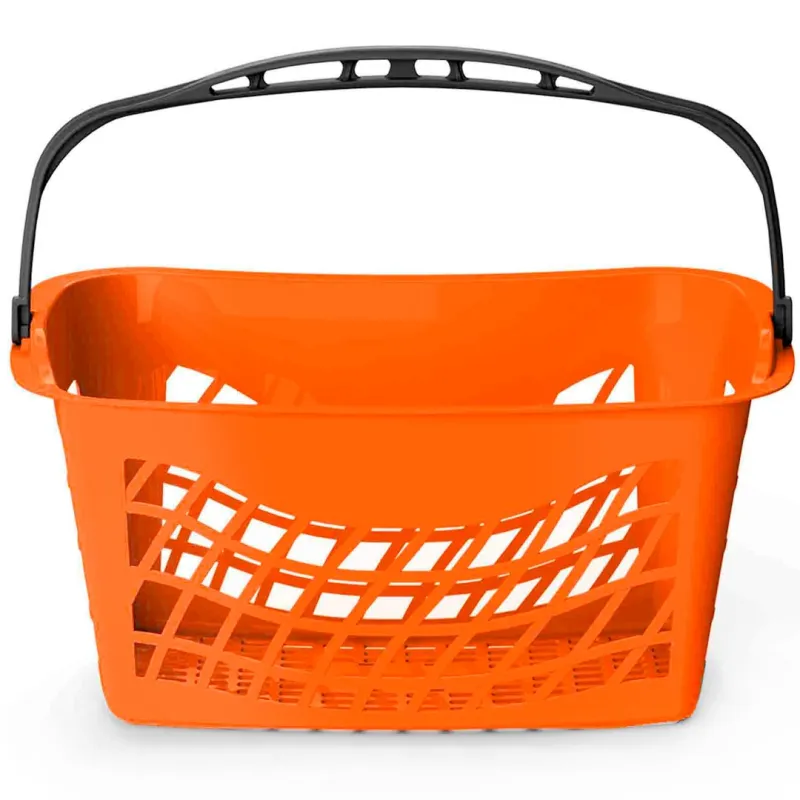 Koszyk sklepowy 26l o szerokości 52cm, głębokości 32cm i wysokości 26cm. Wykonany z tworzywa sztucznego w kolorze pomarańczowym. Na froncie pojemnika znajduje się miejsce z przeznaczeniem na logo. Koszyk posiada jedną składaną czarną rączkę.