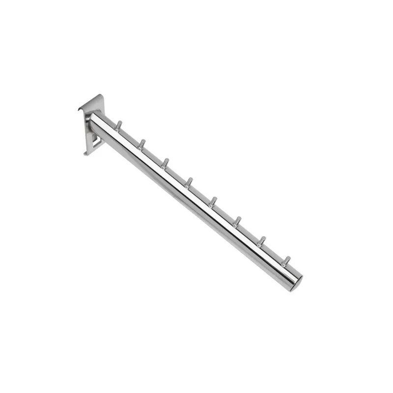 Wieszak pochyły do ekspozycji odzieży frontem do klienta, z bolcami. Wieszak mocowany na kracie, stalowy, chromowany. Wieszak i inne złącza systemu pozwalają budować różnorodne konstrukcje z krat, rur systemu fi 25mm i półek.
