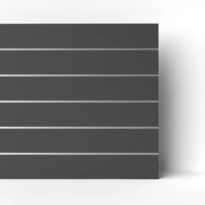 Panel Slatwall Shopwall w kolorze ciemnoszarym, grafitowym. Dekor płyty we wzorniku Kronospanu to Antracyt U164PE. Panel jest wykonany z płyty MDF o grubości 18mm, obustronnie laminowany, o perlistej strukturze powierzchni.Wysokość płyty to 90cm lub 180cm (2 panele po 90cm + wsuwka łączeniowa).