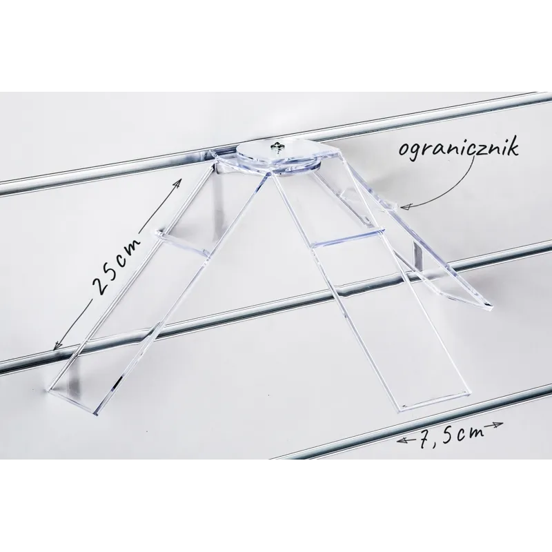 Półka potrójna obrotowa na system Spacewall dedykowana do obuwia lekkiego. Wymiar podstawki półki to 7,5x25cm. Posiada ograniczniki pod obcasami, zapobiegające zsuwaniu się butów. Półka umożliwia jednoczesną ekspozycję trzech butów pod skosem. Ramiona półki są obrotowe i pozwalają na prezentację butów z każdej strony. Ekspozytor można wykorzystać jako urozmaicenie wystawy sklepowej ustawiając na nim najnowsze produkty.