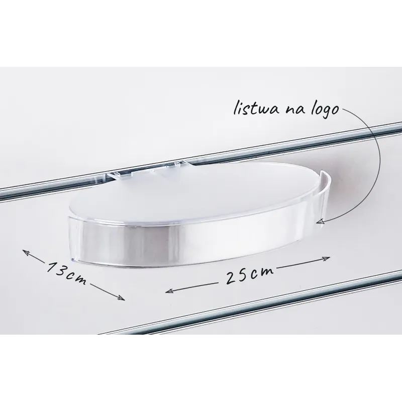 Pozioma półka owalna matowa na system Spacewall o szerokości 25cm i głębokości 13cm z wygiętą, zamocowaną po obwodzie półki zewnętrzną listwą cenową. Półka przeznaczona jest do ekspozycji różnych towarów np w sklepie odzieżowym, obuwniczym, sportowym i w wielu innych. Listwa cenowa umożliwia prezentację ceny i/lub opisu produktu na etykiecie o wymiarach 300x34mm.