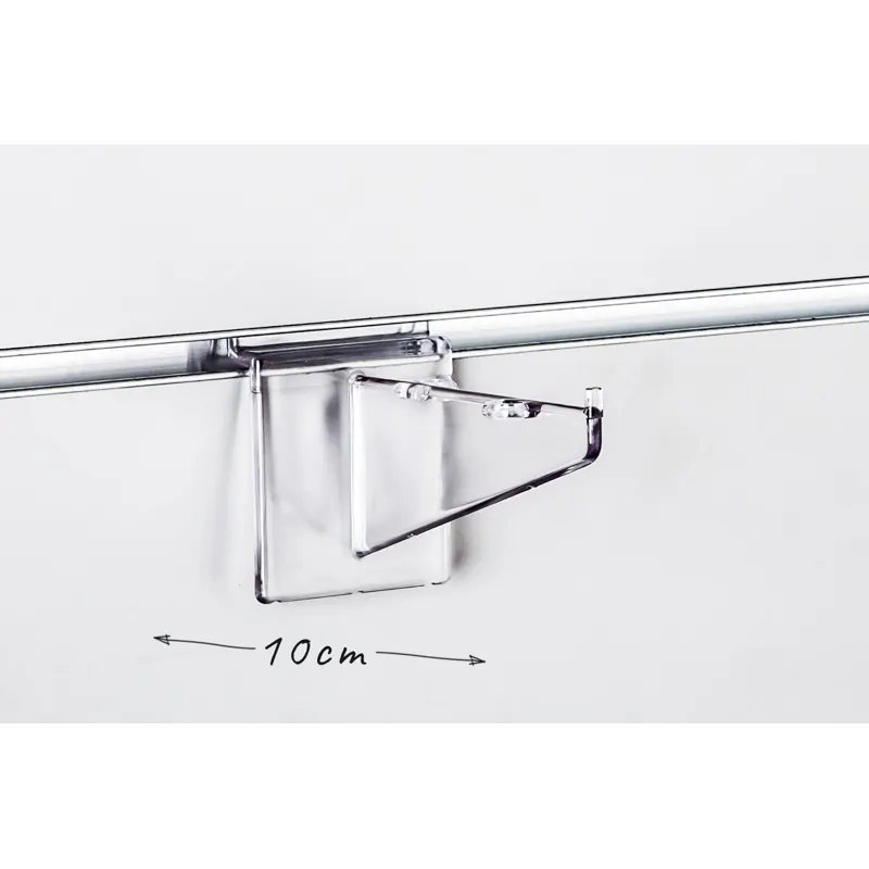 Wspornik pod półki z bezbarwnej plexi. Wspornik ma długość 10cm. Wsporniki są dedykowane do prezentacji lekkich towarów, np. obuwia dziecięcego, biżuterii, okularów.