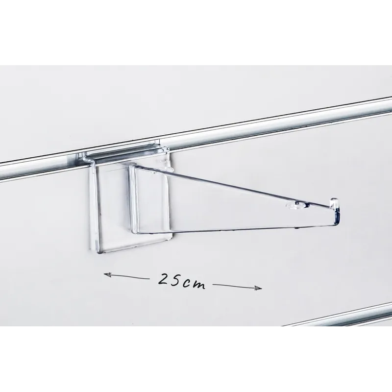 Wspornik pod półki z bezbarwnej plexi. Wspornik ma długość 25cm. Wsporniki są dedykowane do prezentacji lekkich towarów, np. obuwia dziecięcego, biżuterii, okularów.