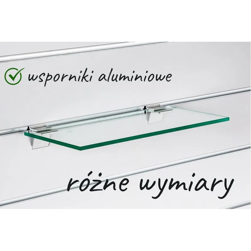 Półka sklepowa szklana Slatwall, wsporniki alu.