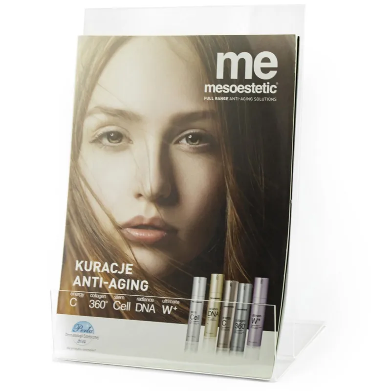 Pozwala na umieszczenie informacji produktowych, regulaminów, parametrów technicznych. Pasuje do standardowej wielkości ulotek o wymiarze A4 i A5. Sprawdzi się w ekspozycji produktów na targach i wystawach oraz przy prezentacji nowych towarów. W tym stojaku mieści się większa ilosć ulotek.