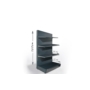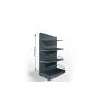 Regał wykonany jest w całości z elementów metalowych, malowanych proszkowo. Nogi perforowane umożliwiają zmianę poziomu/wysokości półki co 5cm. Na nogach zawieszone są plecy pełne, dzielone na segmenty. Półki posiadają wzmocnienia zapewniające stabilność i wysoki udźwig regału. Dodatkowo zaczepy półki pozwalają na montaż półek w dwóch płaszczyznach: poziomej i pochyłej.