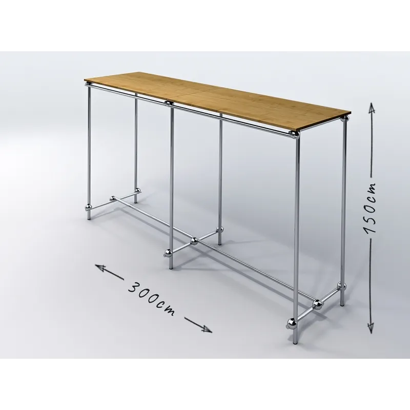 Gondola podwójna wykonana z rury stalowej, chromowanej o średnicy 25mm, elementów łączących chromowanych i czarnych stopek z tworzywa. Półka z płyty meblowej o gr. 18mm, obrzeża PCV. W zestawie klucz imbusowy i instrukcja montażu. Gondola przeznaczona do samodzielnego złożenia.