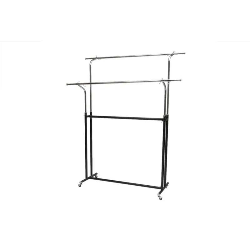 Stender/stojak na kółkach służy do prezentacji, magazynowania i transportu odzieży w sklepie. Wieszak wykonany jest z profili stalowych, chromowanych i metalowej, czarnej podstawy. Wysokość wieszaka jest regulowana od 120cm do 210cm. Szerokość stojaka również jest zmienna od 120cm do 210cm. Głębokość podstawy to 50cm. Wieszak posiada dwa drążki do ekspozycji odzieży. W podstawie wmontowane są małe kółka. Wieszak pakowany do samodzielnego, prostego montażu.