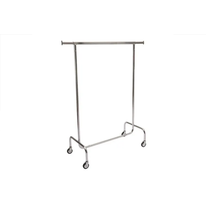 Stender/stojak na kółkach służy do prezentacji, magazynowania i transportu odzieży w sklepie. Wieszak wykonany jest z profili stalowych, chromowanych. Wysokość wieszaka wynosi 150cm. Szerokość stojaka można regulować od 140 do 200cm. Głębokość podstawy to 50cm. W podstawie wmontowane są solidne kółka. Wieszak pakowany do samodzielnego, prostego montażu.