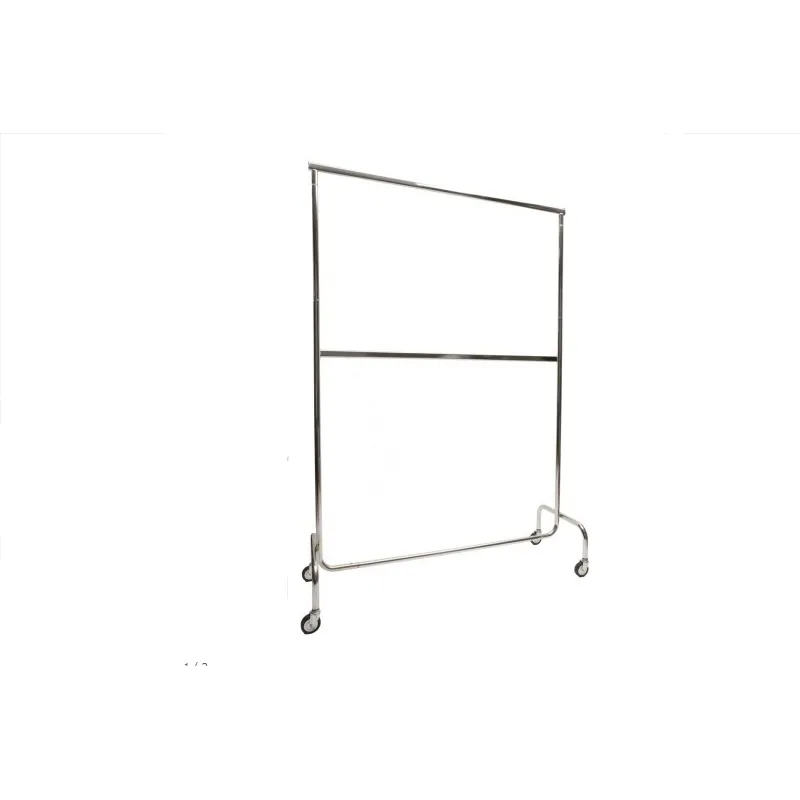 Stender/stojak na kółkach służy do prezentacji, magazynowania i transportu odzieży w sklepie. Wieszak wykonany jest z profili stalowych, chromowanych. Wysokość wieszaka wynosi 200cm. Szerokość stojaka można regulować od 140 do 200cm. Głębokość podstawy to 52cm. W podstawie wmontowane są solidne kółka. Dwa poziomy drążków zapewniają więcej przestrzeni ekspozycyjnej i magazynowej. Wieszak pakowany do samodzielnego, prostego montażu.