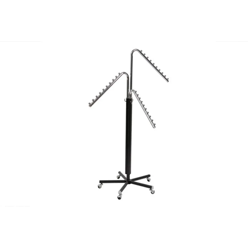 Stender, wieszak trzyramienny, na kółkach służy do prezentacji, magazynowania i transportu odzieży w sklepie. Wieszak wykonany jest z profili stalowych, chromowanych i czarnej, metalowej podstawy. Wysokość wieszaka jest regulowana od 110cm do 185cm. Wieszak posiada trzy pochyłe drążki z kulkami do ekspozycji odzieży. W podstawie wmontowane są kółka. Wieszak pakowany do samodzielnego, prostego montażu.