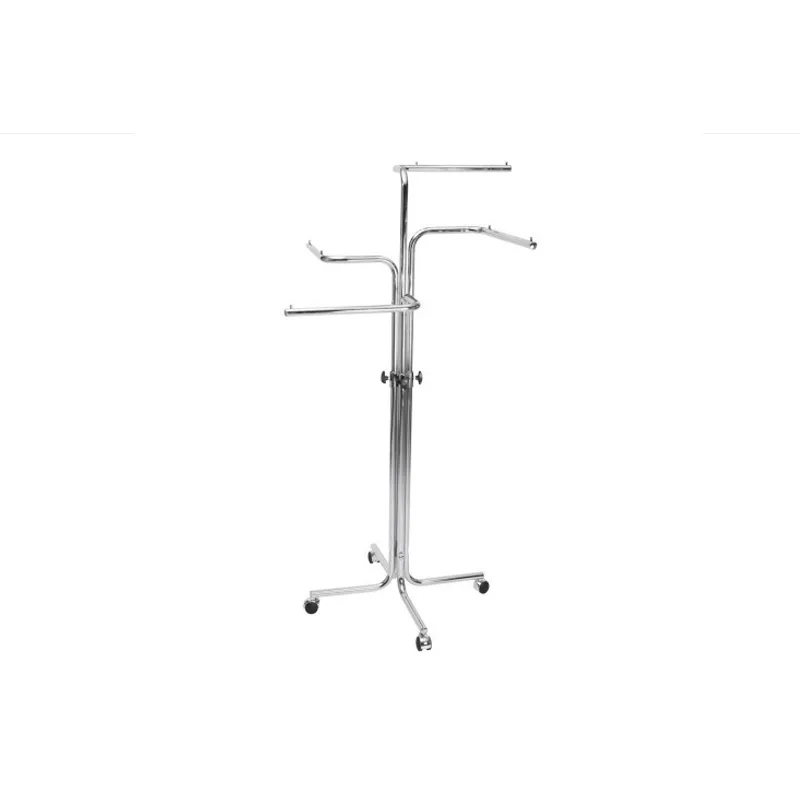 Stender, wieszak czteroramienny, na kółkach służy do prezentacji, magazynowania i transportu odzieży w sklepie. Wieszak wykonany jest z profili stalowych, chromowanych. Wysokość wieszaka jest regulowana od 110cm do 180cm. Wieszak posiada cztery proste drążki do ekspozycji odzieży. W podstawie wmontowane są małe kółka. Wieszak pakowany do samodzielnego, prostego montażu.