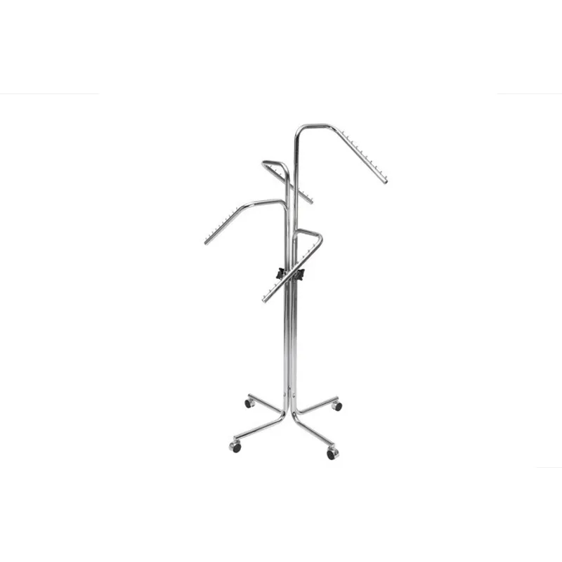 Stender, wieszak czteroramienny, na kółkach służy do prezentacji, magazynowania i transportu odzieży w sklepie. Wieszak wykonany jest z profili stalowych, chromowanych. Wysokość wieszaka jest regulowana od 110cm do 180cm. Wieszak posiada cztery pochyłe drążki z kulkami do ekspozycji odzieży. W podstawie wmontowane są małe kółka. Wieszak pakowany do samodzielnego, prostego montażu.