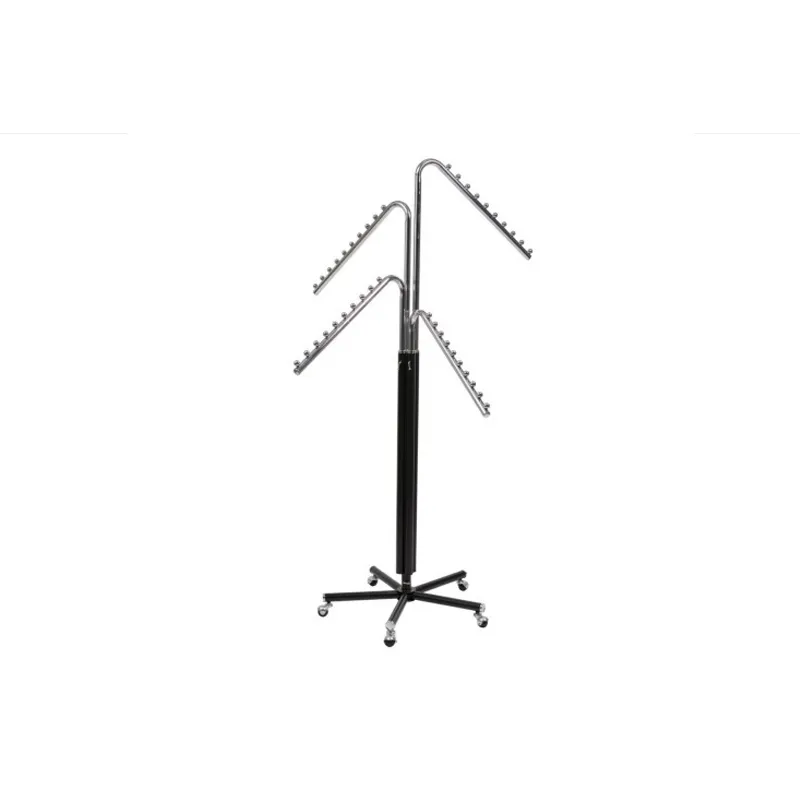 Stender, wieszak czteroramienny, na kółkach służy do prezentacji, magazynowania i transportu odzieży w sklepie. Wieszak wykonany jest z profili stalowych, chromowanych i czarnej, metalowej podstawy. Wysokość wieszaka jest regulowana od 110cm do 185cm. Wieszak posiada cztery pochyłe drążki z kulkami do ekspozycji odzieży. W podstawie wmontowane są małe kółka. Wieszak pakowany do samodzielnego, prostego montażu.
