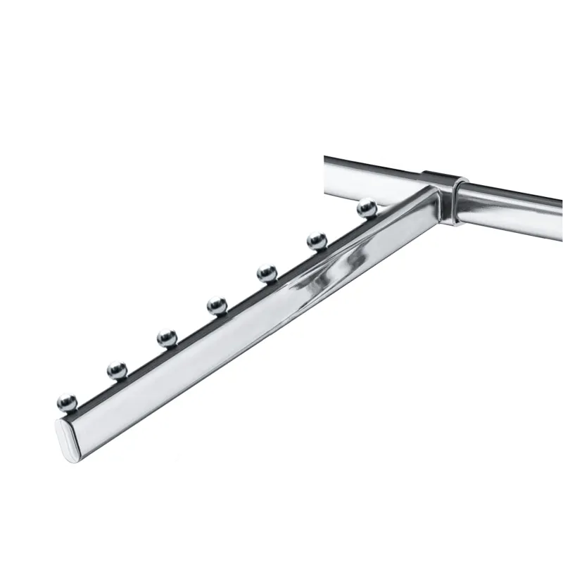 Wieszak skośny z rury owalnej 30x15mm, z kulkami mocowany na wspornik z rury owalnej. Wieszak służy do ekspozycji odzieży frontem do klienta.