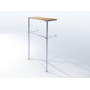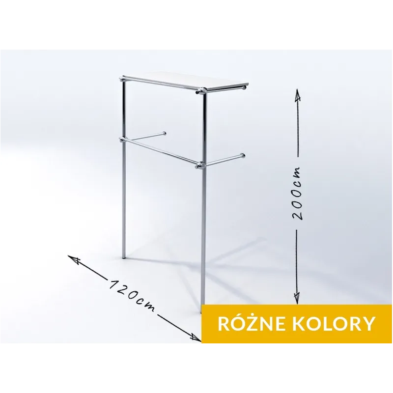 Wieszak przyścienny, wykonany z rury stalowej, chromowanej o średnicy 25mm, elementów łączących chromowanych, czarnych stopek z tworzywa i półki z płyty meblowej o gr. 18mm. W zestawie klucz imbusowy i instrukcja montażu. Wieszak przeznaczony do samodzielnego złożenia.