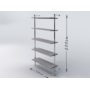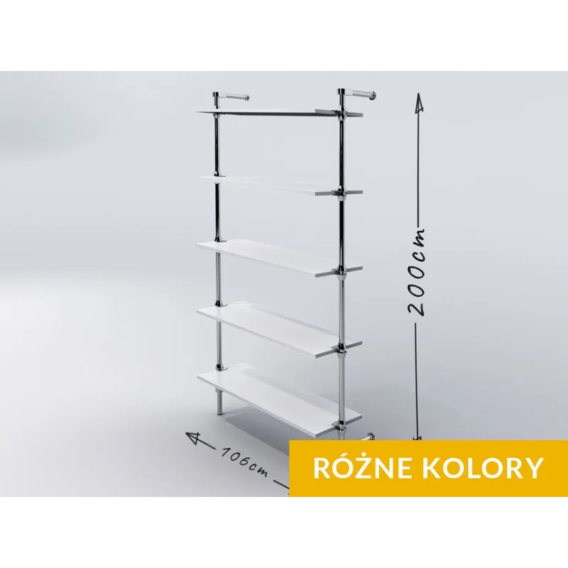 Regał przyścienny, wykonany z rury stalowej, chromowanej o średnicy 25mm, elementów łączących chromowanych i czarnych stopek z tworzywa. Półki z płyty meblowej o grubości 18mm z płynną regulacją poziomu.