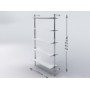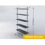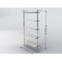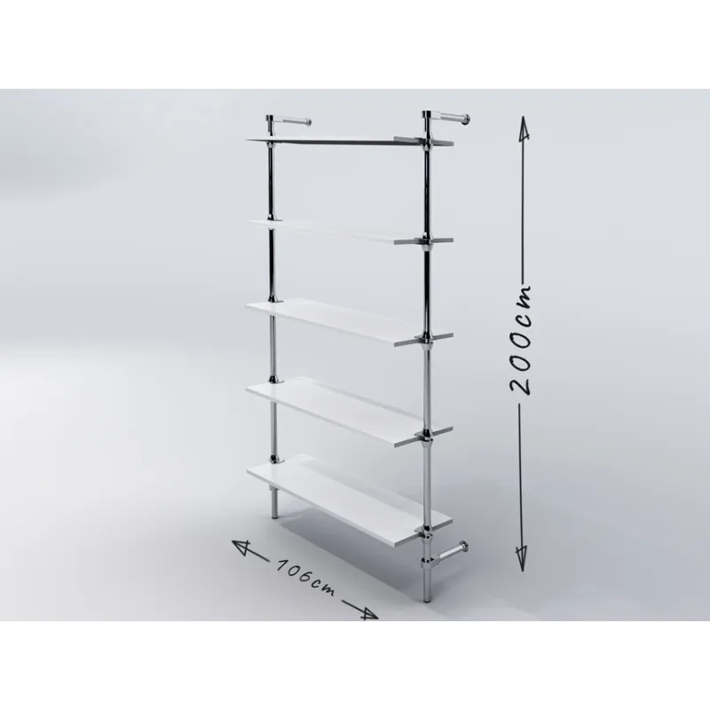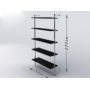 Regał przyścienny, wykonany z rury stalowej, chromowanej o średnicy 25mm, elementów łączących chromowanych i czarnych stopek z tworzywa. Półki z płyty meblowej o grubości 18mm z płynną regulacją poziomu.