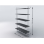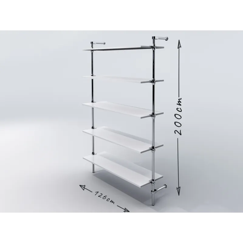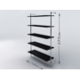 Regał przyścienny, wykonany z rury stalowej, chromowanej o średnicy 25mm, elementów łączących chromowanych i czarnych stopek z tworzywa. Półki z płyty meblowej o grubości 18mm z płynną regulacją poziomu.