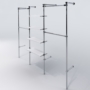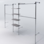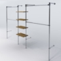 Wieszak przyścienny, dwupoziomowy z czterema półkami, wykonany z rury stalowej o średnicy 25mm oraz elementów łączących. Wszystkie elementy stalowe wykończone w chromie. Półki z płyty meblowej o gr. 18mm z obrzeżem PCV.