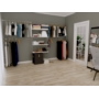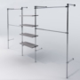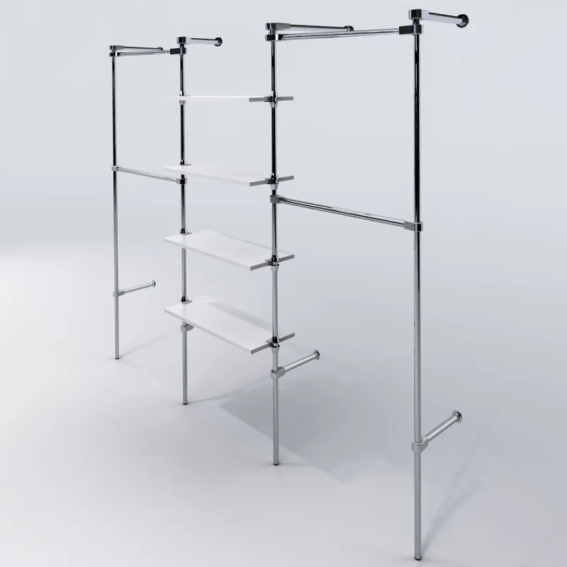 Wieszak przyścienny, dwupoziomowy z czterema półkami, wykonany z rury stalowej o średnicy 25mm oraz elementów łączących. Wszystkie elementy stalowe wykończone w chromie. Półki z płyty meblowej o gr. 18mm z obrzeżem PCV.