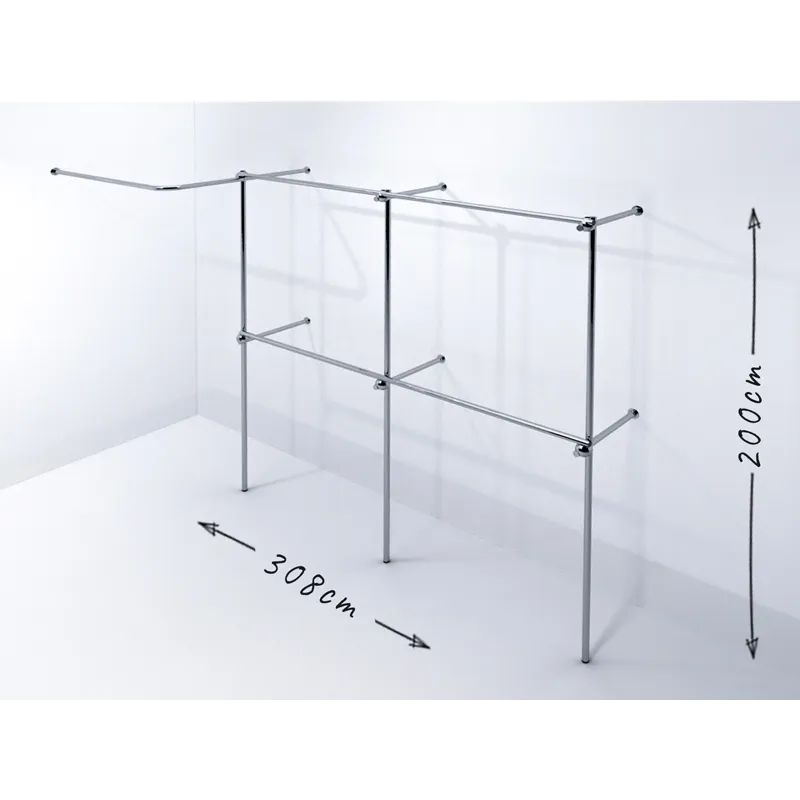 Wieszak, stojak sklepowy, dwupoziomowy, narożny, z przymierzalnią, mocowany do ściany, przeznaczony do ekspozycji odzieży bokiem, wymiary 308x40-100x200cm, chromowany.
