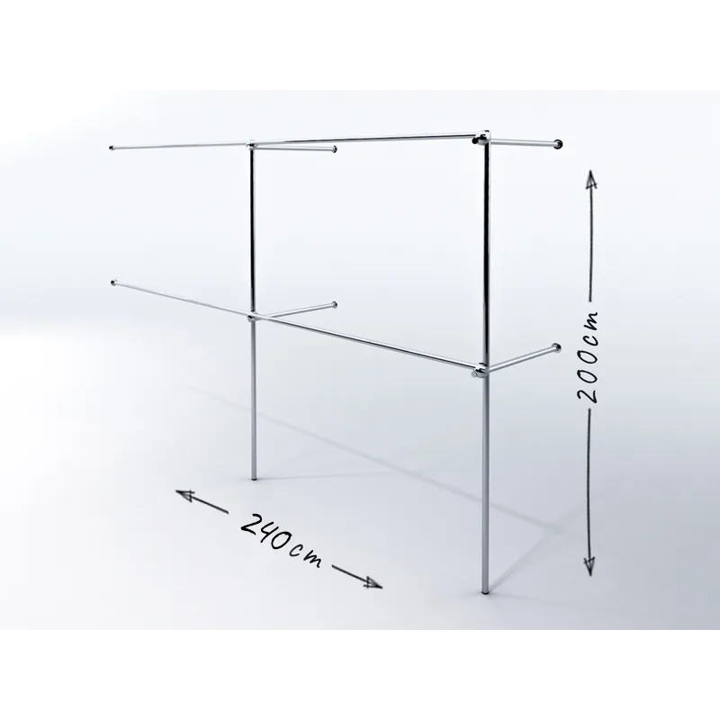 Wieszak narożny, wykonany z rury stalowej, chromowanej o średnicy 25mm, elementów łączących chromowanych i czarnych stopek z tworzywa. W zestawie klucz imbusowy i instrukcja montażu. Wieszak przeznaczony do samodzielnego złożenia.