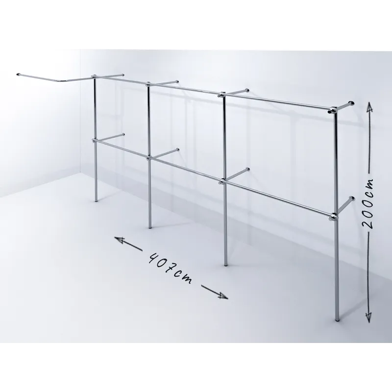 Wieszak, stojak sklepowy, dwa poziomy drążków, narożny, z przymierzalnią 100x100cm, mocowany do ściany, przeznaczony do ekspozycji odzieży bokiem, wymiary 407x40-100x200cm, chromowany