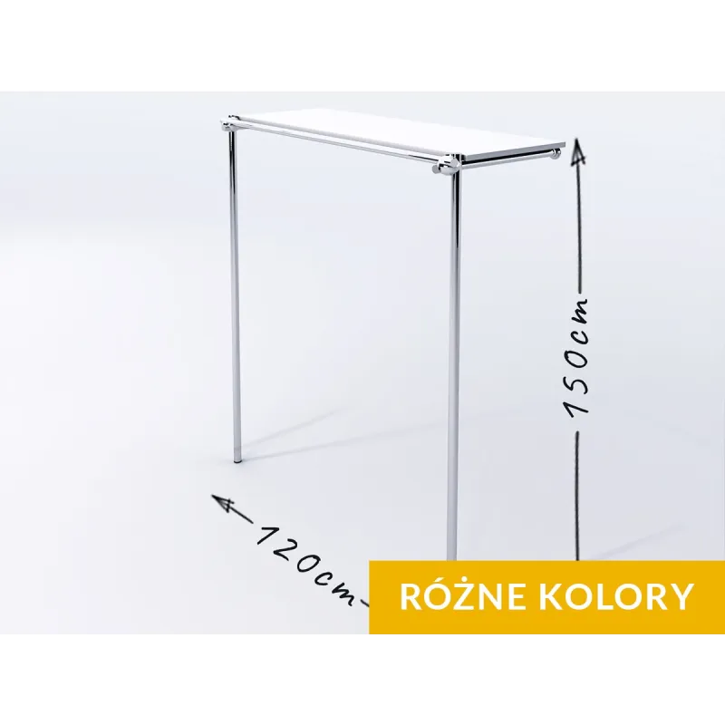 Wieszak przyścienny, wykonany z rury stalowej, chromowanej o średnicy 25mm, elementów łączących chromowanych, czarnych stopek z tworzywa i półki z płyty meblowej o gr. 18mm. W zestawie klucz imbusowy i instrukcja montażu. Wieszak przeznaczony do samodzielnego złożenia.