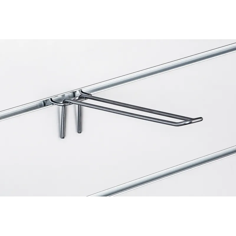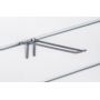 Haczyk podwójny, wykonany w całości z drutu, malowany proszkowo na kolor srebrny. Zaczep na panel Spacewall wykonany z drutu. Pasuje do towarów w opakowaniu z eurozawieszką. Towary zawieszane na podwójnym haczyku nie przechylają się- wiszą równo.