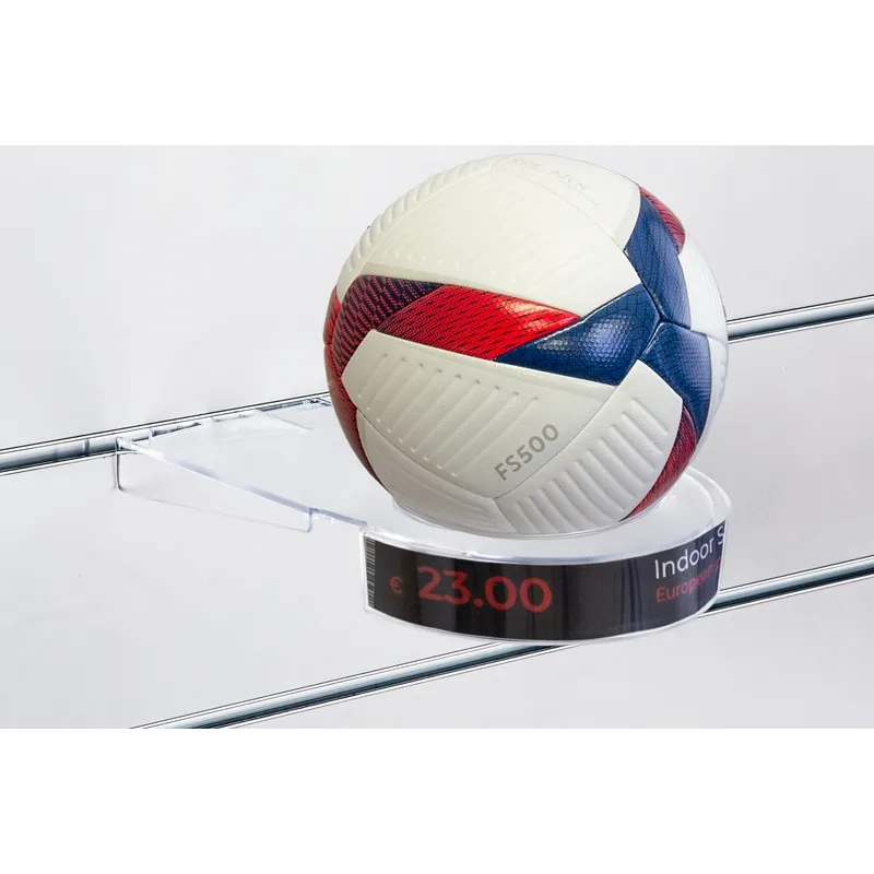 Pleksi w miejscu na piłkę jest matowa. Obrzeze z przodu półki jest przezroczyste. Ekspozytor można wykorzystać jako prezentację najnowszych towarów.